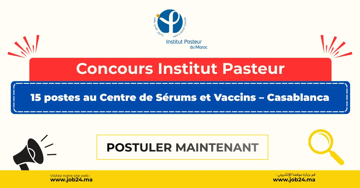 Le concours Institut Pasteur du Maroc 2026 concerne le recrutement de plusieurs profils au sein du Centre de Sérums et Vaccins, situé à Casablanca. Ce concours public s’inscrit dans le cadre du renforcement des ressources humaines d’un établissement public à caractère scientifique et sanitaire relevant du secteur de la santé.