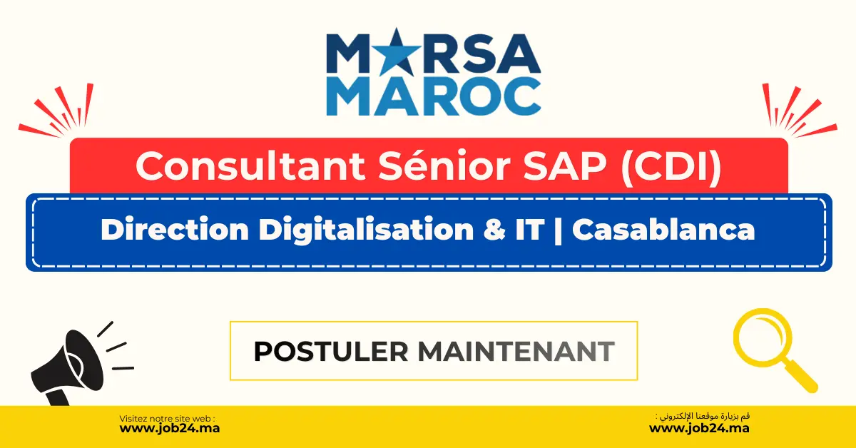 Marsa Maroc recrute un Consultant Sénior SAP en contrat CDI. Le poste est rattaché à la Direction Digitalisation & IT et s’inscrit dans un contexte de modernisation continue des systèmes d’information de l’entreprise. L’affectation principale est basée à Casablanca, avec des interventions possibles au niveau des ports du Royaume selon les projets et les besoins opérationnels.