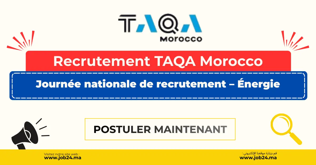 TAQA Morocco organise une journée de recrutement nationale à travers le Royaume afin d’identifier plusieurs profils pour accompagner le développement de ses activités. Les opportunités proposées concernent différents métiers et fonctions, avec des possibilités de CDI selon les postes.